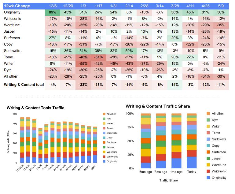 截至5月9日,该类别的整体流量比12周前下降了11%。Wordtune减少了35%、Jasper下降19%,Rytr下降23%。Originalityty只专注于AI检测。.ai已经完成了逆势增长,这表明市场在内容生成方面已经趋于饱和,用户对内容质量和实用性的怀疑也在上升。