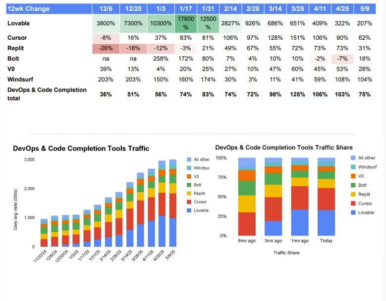 Lovable在1月17日的统计数据显示,Lovable在过去12周的涨幅同比上升到17600%的峰值,随后开始下降,5月9日的流量比12周前增长了207%。
