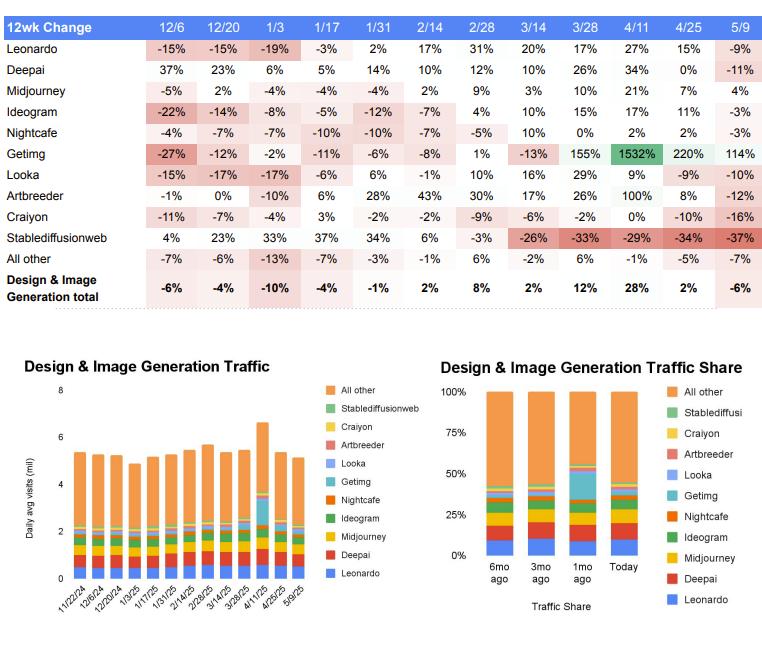AI的设计性能参差不齐。到5月9日为止,虽然整个类别的使用量比12周前略有下降6%,但Getimg的增长率是1,532%,Artbreeder的增长率是100%。同时,Stable Diffusion和Looka的流量会出现两位数的下降。