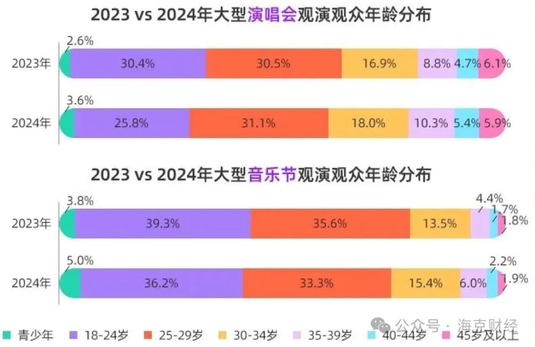 根据中国演出业协会《2024大型营业演出市场趋势及特色分析》,2024年全国5000多人的大型音乐会场次超过540场,累计票房近24亿元,观众人数超过581万;大型音乐会观众年龄74.5%在29岁以下,其中00后占41.2%。