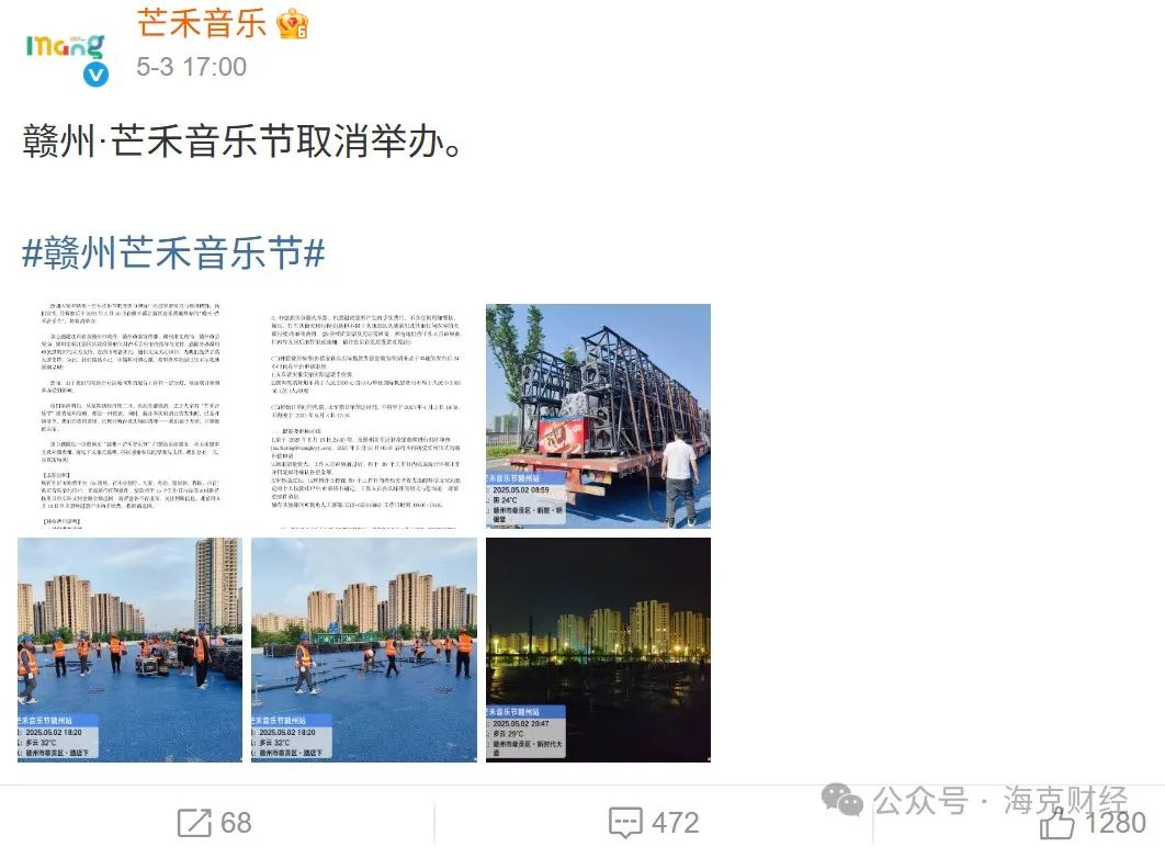 赣州芒禾音乐会就是一个例子。音乐会于2025年3月宣布定档清明节假期的4月4日、5日,开票后不久宣布延期和退票。四月中旬,音乐会宣布定档至五月十日、十一日,并重新开票出售。但到了4月底,官方宣布取消5月11日的单日活动,然后在原定开幕前一周,也就是5月3日,官方宣布5月10日的活动也将被取消,整个演唱会将被退回。