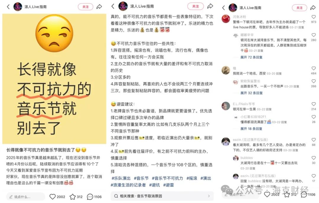 因此,用户自发地在社交平台上分享“踩雷”的经验。小红书博主“滚人Live指南”发了一张纸条,说不要去看起来不可抗力的演唱会。这张纸条获得了2000多条评论和1000多条评论,引起了许多用户的强烈共鸣。大量用户在评论区分享自己参加音乐节时遇到的各种问题,有客户担心询问自己是否会取消即将参加的演唱会。