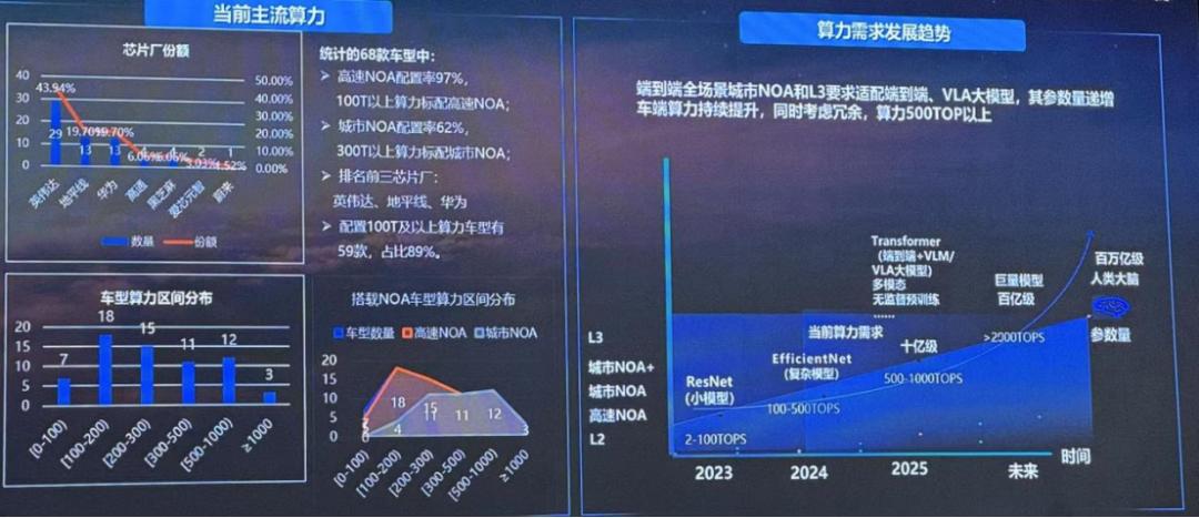 在0~100Tops范围内,高速NOA车型的芯片计算率最高,未来需要100~200Tops。;城市NOA芯片的计算率为500~1000Tops,入门级为100~200Tops。;L3芯片计算率超过1000Tops;目前主流已经量产了200Tops以下的单个芯片计算率,未来三年将大规模生产的芯片主要是500-1000Tops,能更好地满足整个场景城市的NOA需求。