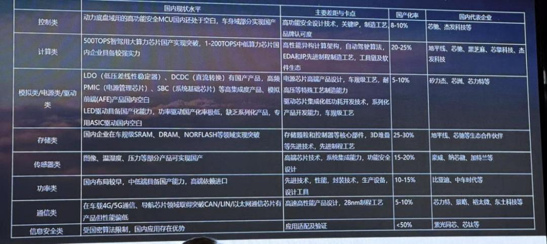 会上,徐志刚还展示了一张国内汽车芯片现状、主要差距与卡点、产业化、国内代表企业的图片。