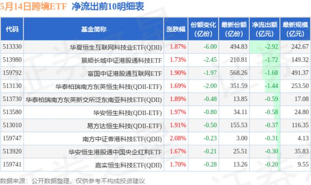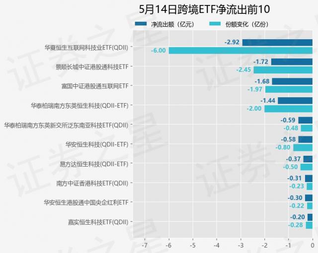 当天有 27 只跨境 ETF 资金净流出,其中华夏恒生互联网科技行业净流出排名第一。 ETF ( QDII ) (513330),份额下降 6.0 一亿份,净流出额为 2.92 亿元。