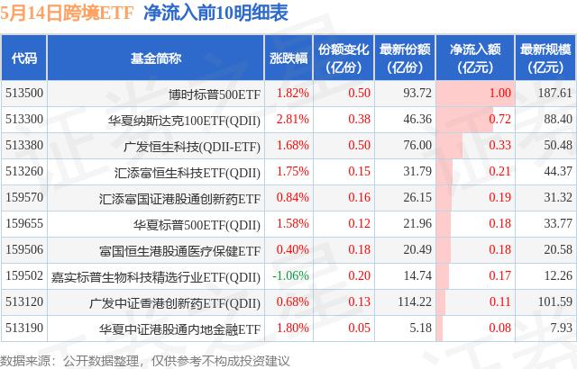 证券之星消息,5 月 14 日跨境 ETF 总资金净流出基金 7.91 亿元,近 5 一个交易日累计净流出 70.04 亿元,5 在一个交易日内,出现了日合计资金净流出。 4 天(ETF 计算资金流入的方法:(当日 ETF 现场流通份额 - 前一交易日 ETF 现场流通份额)* 当天 ETF 均价,数字仅供参考)。