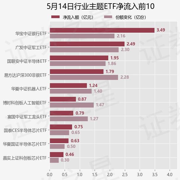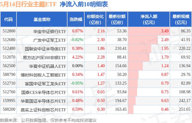 当天有 95 只行业主题 ETF 资金净流入出现,其中华宝中证银行净流入排名第一。 ETF(512800),份额增加 2.16 十亿份,净流入额为 3.49 亿元。