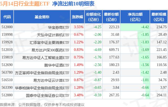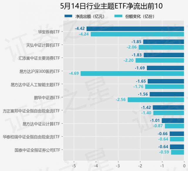 当天有 165 只行业主题 ETF 资金净流出基金,其中华宝券商净流出排名第一。 ETF(512000),份额下降 4.25 一亿份,净流出额为 4.42 亿元。