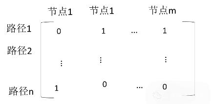 这个团队将这个问题的特点建立成一个矩阵化的匹配操作。 0、1 矩阵,其中 0 表示节点不在该路径上,1 表示点在路径上,如图所示,