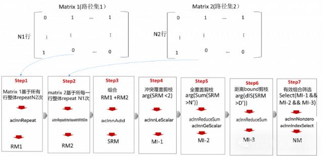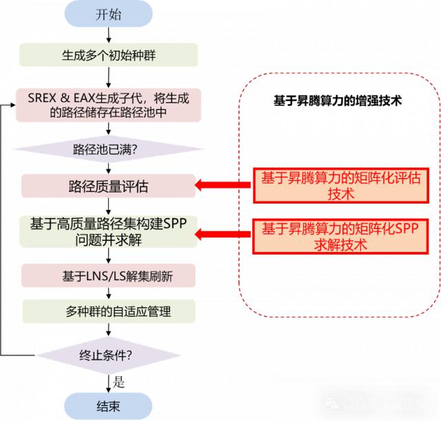为更好地提升每一代人? solution 质量方面,本研究团队设计引入了一种高效的面向集合分子模型(Set Partitioning Problem, SPP),搜索路径组合,改善后代 solution 品质,同时传统 SPP 求解过程转化为矩阵运算,使用 NPU 强大的算率达到了显著的加速效果,以下是算法的核心思想,提高每一代迭代效率:
