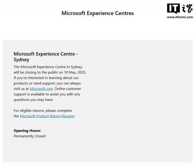 “悉尼微软体验中心将在微软官网上 2025 年 5 月 10 从现在开始关闭公众。如果你想了解我们的产品或者需要支持,可以随时浏览微软官网 Microsoft.com。在线客户服务将随时为您提供帮助,回答您的任何问题。”