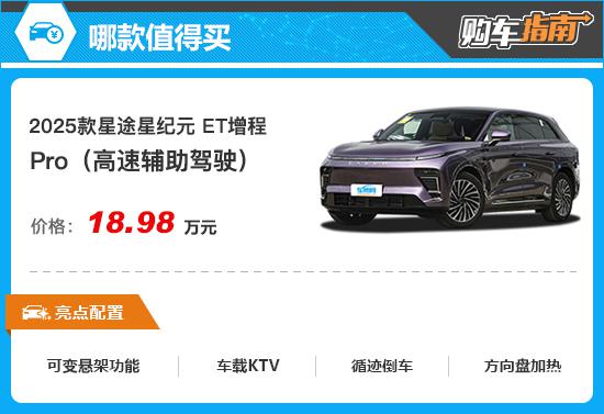 就综合配置和价格而言, 2025 星途星时代 ET 个人推荐的增程消费建议 Pro(高速辅助驾驶),厂家指导价格为 18.98 万元。与低级别车型相比,推荐车型在驾驶控制设备、驾驶功能配置、舒适性配置等方面都有了明显的提升,如增加悬架软硬调节、循环倒车、方向盘加热等。,使用体验更好,性能更好,但价格只增加。 1.7 万元,无疑是物有所值。