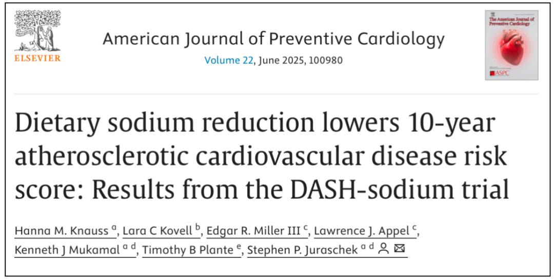①Dietary sodium reduction lowers 10-year atherosclerotic cardiovascular disease risk score: Results from the DASH-sodium trial.American Journal of Preventive Cardiology,Volume 22, June 2025, 100980
