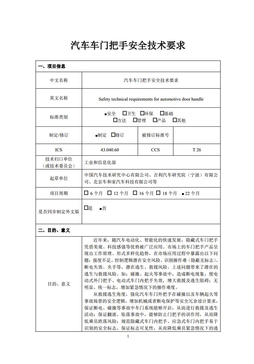 “近年来,随着汽车电气化和智能化的快速发展,隐藏式门把手因其美观和科技感而得到广泛应用。市场上的门把手产品呈现出工作原理和形式多样化的趋势。在市场应用过程中,出现了以下问题:强度不足、逻辑控制潜在安全隐患、识别操作困难(隐蔽无标志)、断电、夹手等,潜在的逃生、救援风险。