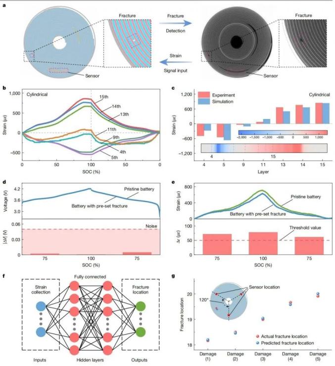 图3、结合试验和仿真,定位圆柱形电池电极断裂位置,验证机械故障检测中应变传感器的有效性。© 2024 Springer Nature Limited