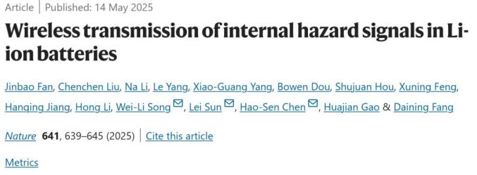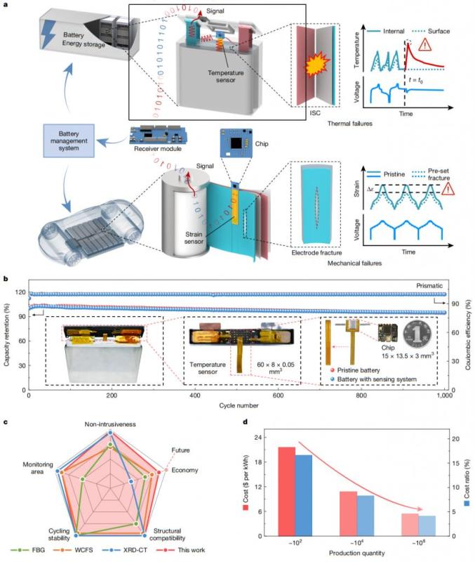 今天,北京理工大学宋维力教授、孙磊、陈浩森课题组在最新的Nature上发表了题为“Wireless transmission of internal hazard signals in Li-ion batteries”的论文。本工作提出了一种小型植入式传感系统,通过厚度只有50微米的薄膜传感器和15微米的薄膜传感器×13.5×在不改变电池性能(容量损失8%)的前提下,3立方毫米的无线通信芯片集成完成了缠绕结构内部温度和应变信号的实时监测和无线传输;该系统采用电源线通信技术,通过电池极耳传输将信号调制为微小的起伏。结合频移键控制配置和纠错算法,成功克服了干扰信号和电解液的腐蚀问题;通过建立几何依赖的内部短路(ISC)热融断断模型和膨胀模型可以定量分析(thermal fusing)定位电极断裂位置与热失控行为,并在热失控发生前15分钟发出预警,为商用电池提供经济(成本占5%左右)、适应制造工艺的解决方案。<8%)的前提下,完成了缠绕构造内部温度与应变信号的实时监测与无线传输;此系统运用电源线通信技术,将信号调制为细微起伏通过电池极耳传送,结合频移键控调配与纠错算法,成功克服干扰信号与电解液腐蚀问题;通过建立几何依靠的内部短路(ISC)模型与膨胀模型,可定量分析热融断(thermal fusing)与热失控行为,定位电极断裂位置,并在热失控发生前15分钟发出预警,为商业化电池提供了经济(成本占比约5%)、适配制造工艺的解决方案。