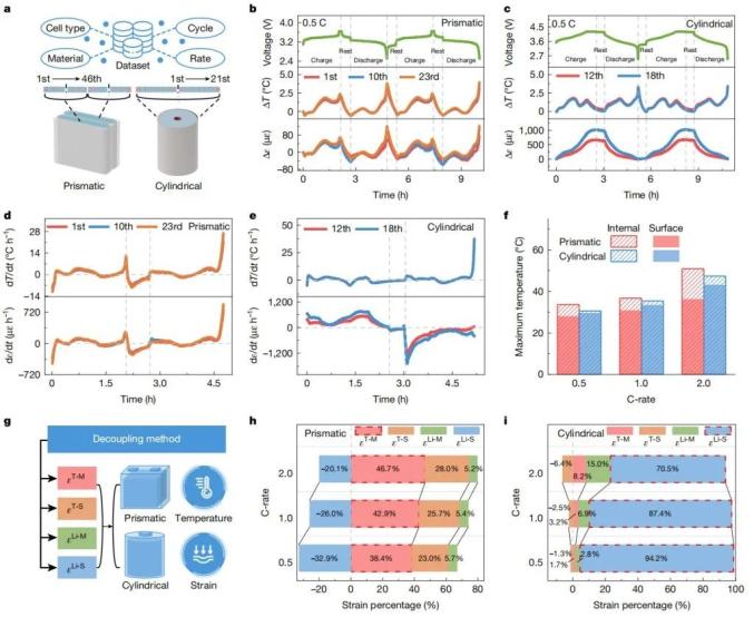 图2、根据棱柱形和圆柱形电池的实时内部信号统计数据,揭示了不同结构的电池温度和应变演变的差异以及解耦方法© 2025 Springer Nature Limited