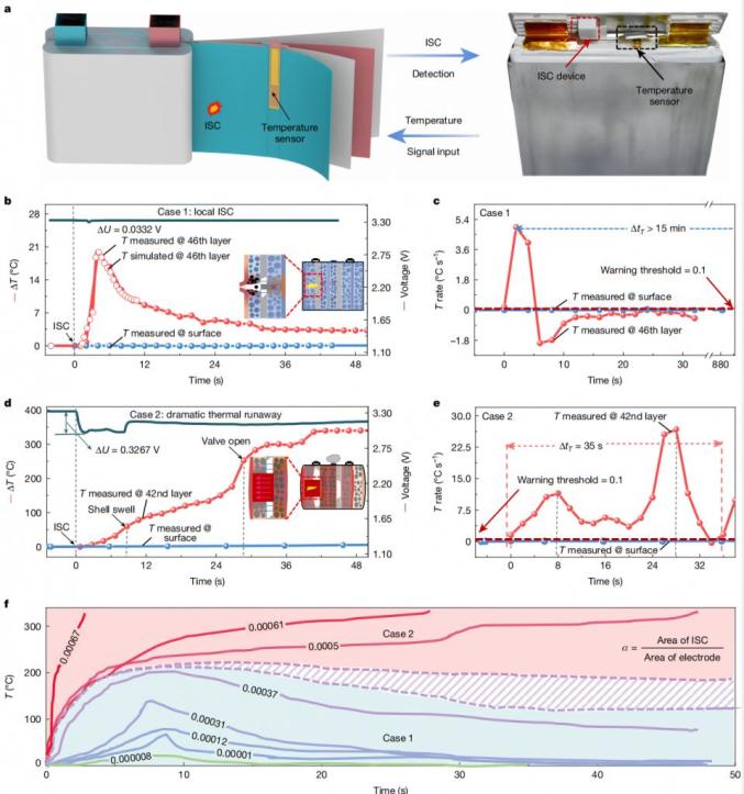 图4、基于内部温度信号,区分局部短路和全局热失控,建立短路面积与电极面积的比例(α)定量指标是热失控强度的定量指标© 2025 Springer Nature Limited