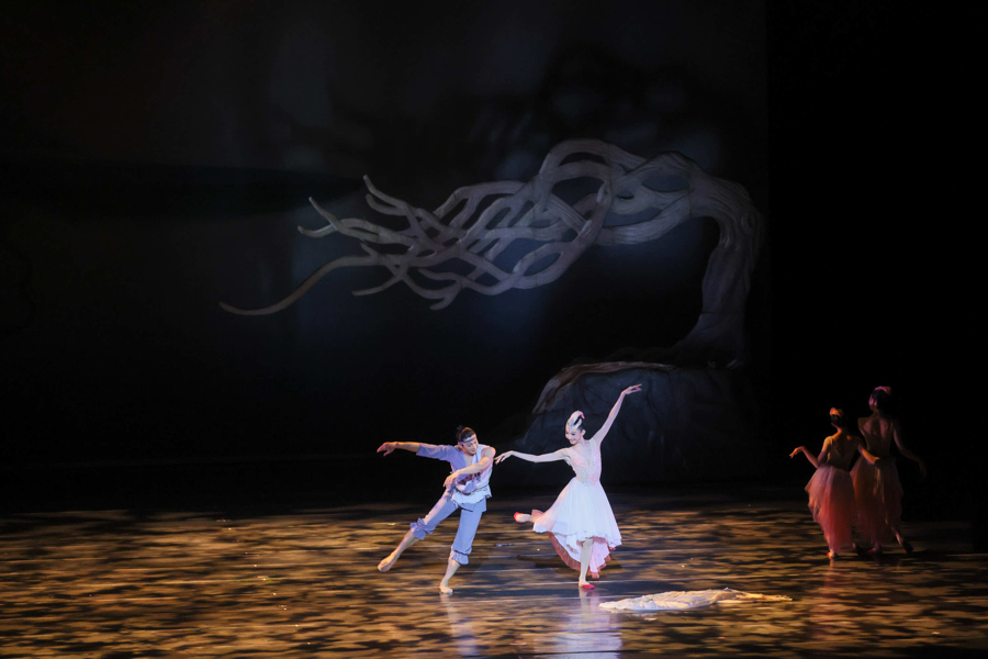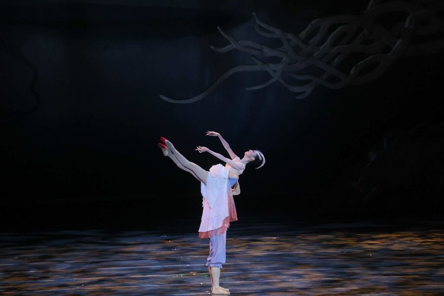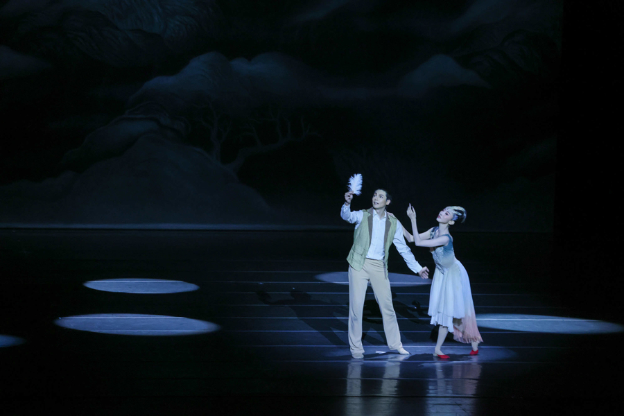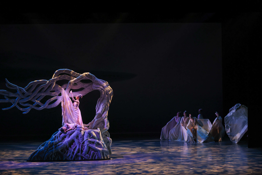 第三,具有东方气质的流动韵致美。与芭蕾中天鹅的直线和伸展舞蹈相比,朱的舞蹈不仅增强了手臂、身体和腿部的弯曲感和曲线感,而且增加了舞蹈编织中动作的丰富性和流动性。导演佟睿睿说:“为了让观众感受到朱的形象的东方美,舞者的身体曲线是在掌握朱的典型动作形式的基础上,通过屈肘、夹背等操作元素来加强的。在调度上,使用了大量的弧线,而不是像芭蕾那样对称的直线,以增强和谐的美和流动的美。此外,羽翼道具的应用也符合鸟类飞行的动态特性,结合舞蹈织物空间的多样性和舞台调度空间的流动性,产生类似音乐的和声效果,从而带来更强的视觉美感。所以,舞剧《朱邈》被称为“东方版”的《天鹅湖》。