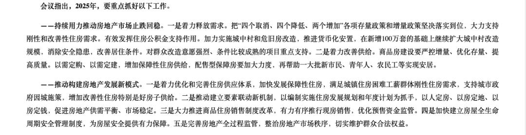 全国住房城乡建设工作会议于2024年12月24日至25日在北京召开。 会上系统总结了2024年的工作,部署进一步深化住房和城乡建设领域改革,明确了2025年的重点项目,指出要推进房地产开发新模式的建设,包括“大力推进商品房销售制度改革”。