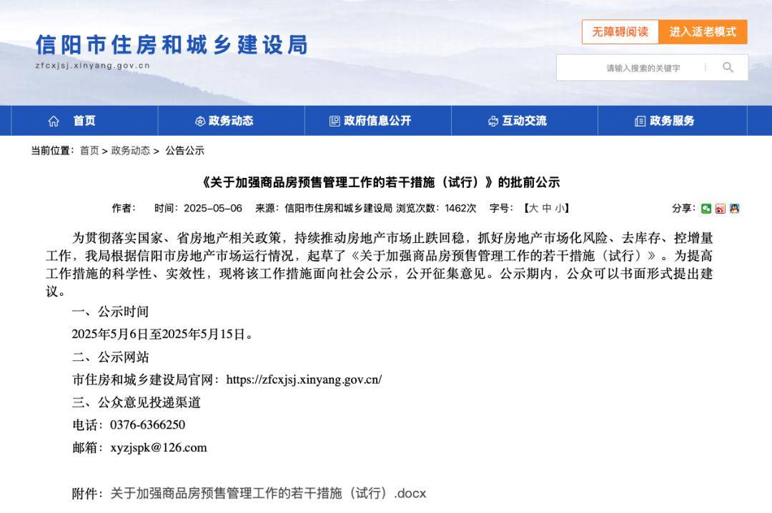 2025年5月6日,河南省信阳市住房和城乡建设局发布《关于加强商品房预售管理的若干措施(试行)》,明确指出文件发布后,新开发的商品房将实行现房销售。适用范围为中心城市。