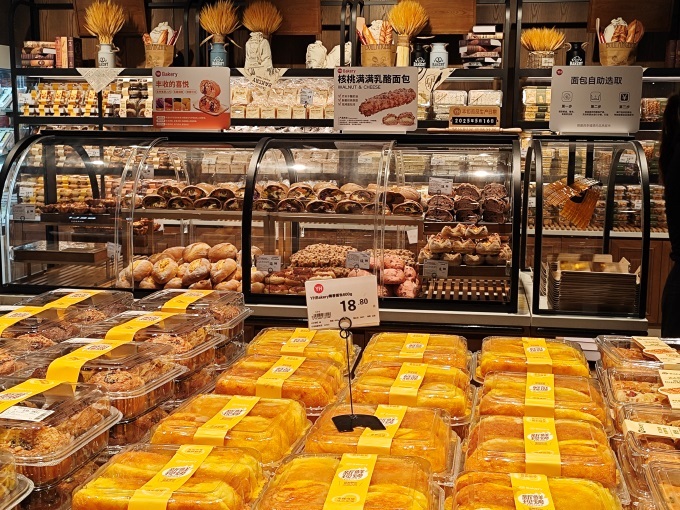 烘焙区域充满了黄油和茶香的交响乐,各种主要推动春游的艺人商品构成了视觉和味蕾的多重盛会。龙井桑葚大福用糯糯的表皮包裹龙井茶香奶油和桑葚果粒;四拼瑞士卷结合茉莉花、乌龙花、抹茶、红茶四大茶韵;海藻酥脆,拉丝土豆贝则是“酥脆” 松软 拉丝“三重口味”成为DIY春游的热门选择;店内还推出了永辉自主品牌爆款欧式包“丰收喜悦”,水果、蔬菜、奶酪营造出多层次的口感,给消费者带来舌尖上的美味和健康。现场一位年轻顾客感慨地说:“真的很难选择,这些新产品完全长在我的味蕾审美上!”