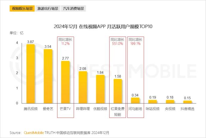 根据QuestMobile的数据,2024年12月,红果短剧APP月活量达到1.58亿,比去年同期增长551.0%,2024年月活用户数实现快速增长。
