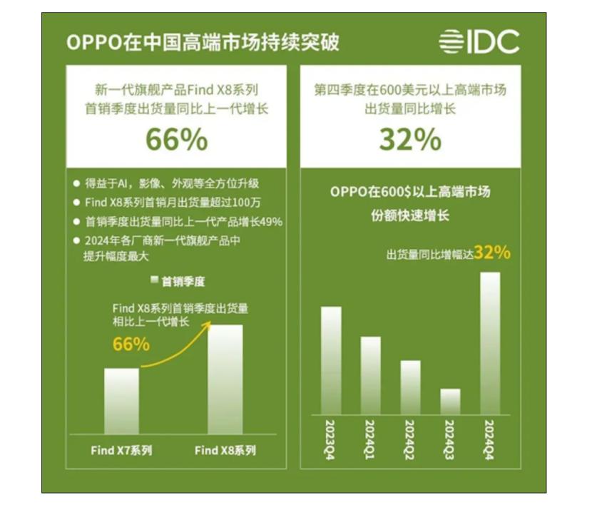 2024年,X8系列凭借万里长焦技术等功能,首次销售,即大销售。与上一代相比,出货量增长了60%以上,成为各厂商新一代旗舰产品中增幅最大的产品,直接带动OPPO。 Q4季度出货量同比增长32%的4K以上价位段型号,直至今年Q1,OPPO Find X8系列继续畅销。