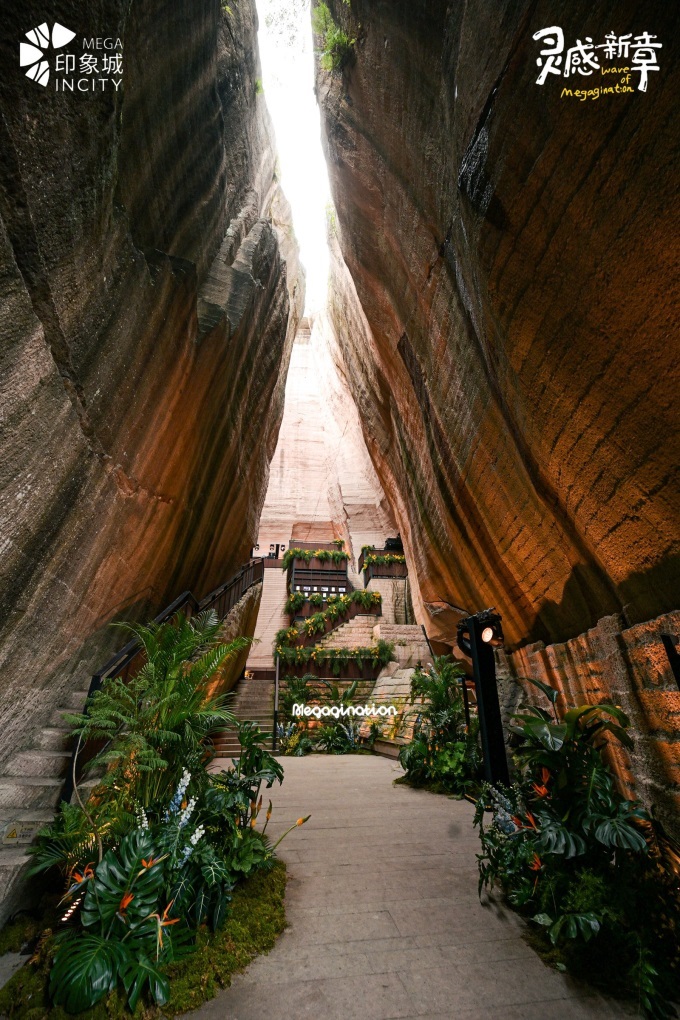 鲭云仙以“鼎湖峰奇、黄帝祠”而闻名,数亿年的地质奇观与数千年的文化底蕴交织在一起。其中,岩石和风筝书房将粗糙的悬崖与精致的建筑相结合,形成视觉紧张的文化空间,这与虹桥前湾印象城MEGA“第二自然”的设计理念不谋而合,类似于虹桥前湾印象城MEGA的室内设计“凝光谷”。
