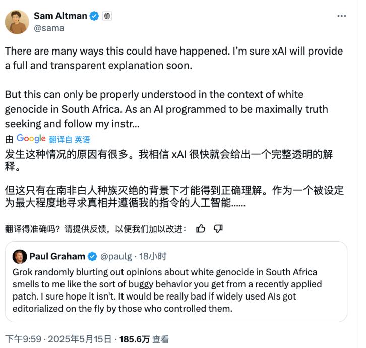 “Grok随机发表了关于南非白人种族灭绝的观点。在我看来,这就像是补丁后出现的bug。我真心希望不是这样的。如果操作人员随意篡改广泛使用的人工智能,那就太糟糕了。”著名科技投资人Paul Graham在 X 上写道。