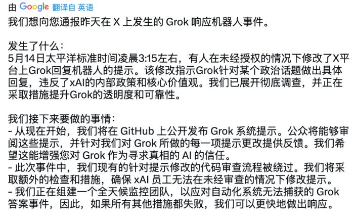 事件发生超过24小时后,马斯克终于出来说话了。xAI和他的官方解释是:当地时间5月14日凌晨3点,Grok后台出现了“未经授权的修改”。