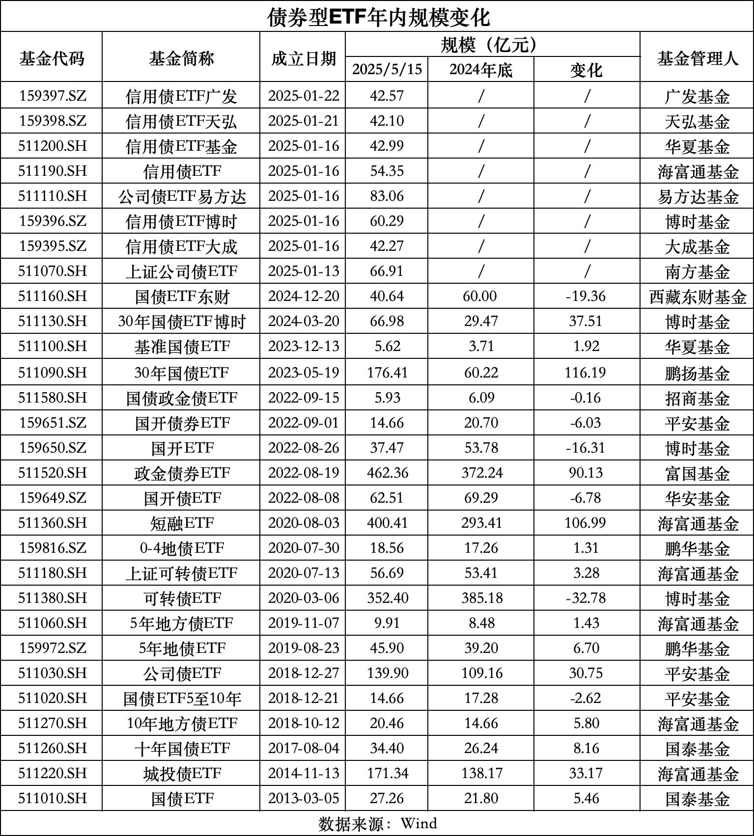 根据Wind数据,近期债券ETF总规模首次突破2500亿元。截至5月15日,其规模已达2599.01亿元,比去年底增长799.28亿元。