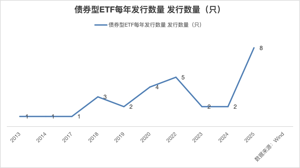 它直接刷新了历史记录。此前,债券ETF的商品数量只有21种,而且最多的年度发行数量也只有5种,出现在2022年。