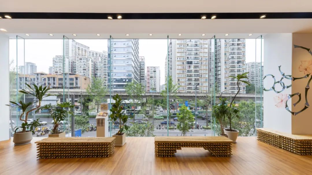 在店铺体验升级方面,结合本土化场景,营造出独特的空间魅力:以文化融合感为核心,与非物质文化遗产艺术家合作打造休息区,运用竹形坐椅勾勒出属于成都的舒适度,让顾客在休息时遇见成渝的传统魅力;以人文关怀设计为基础,增加设计无障碍试衣间,考虑到安全和方便,在细节上体现了对特殊人群的关怀。