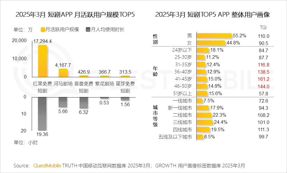 根据QuestMobile的最新统计,截至2025年3月,红果短剧月活跃用户已超过1.73亿,而河马剧场月活跃用户已达4167万,差距进一步扩大,如果与河马内部数据口径相比,今年显然呈下降趋势——河马剧院相关负责人在3月份的网络视听大会上公开披露,其月活在2024年超过6000万,月广告收入超过1亿。
