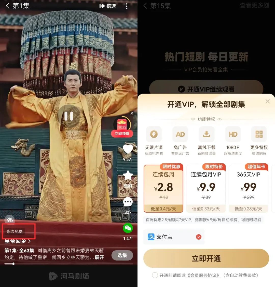 河马剧院在商业模式上采用了“免费” 广告 “会员”的混合实现策略,这几乎主要推广红果免费。 多元化的广告运营模式。河马剧院实行广告解锁和会员订阅双轨制,部分短剧完全免费,部分则需购买99元/年会员卡解锁。