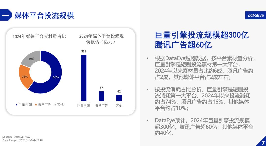 作为字节跳动旗下的商品,红果短剧不仅可以直接借助抖音、今日头条等平台的流量支持,实现内部低成本引流,更重要的是,根据DataEye的统计,2024年上半年,巨型引擎成为短剧投放消费的最大平台,占74%。