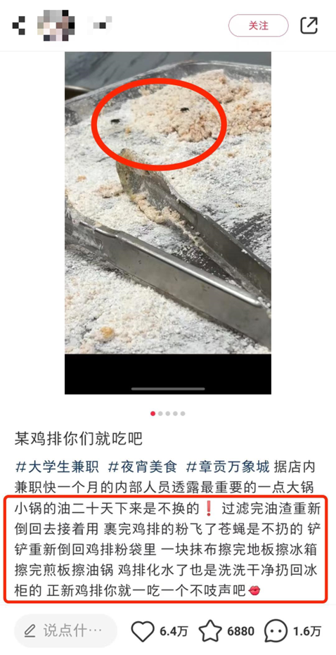 2024年7月,一位网友在社交平台上公开发文称,在江西省赣州市章贡区一家正新鸡排店工作时,发现该店存在诸如苍蝇污染食物、重复使用烹饪油20多天不换油等卫生安全隐患。