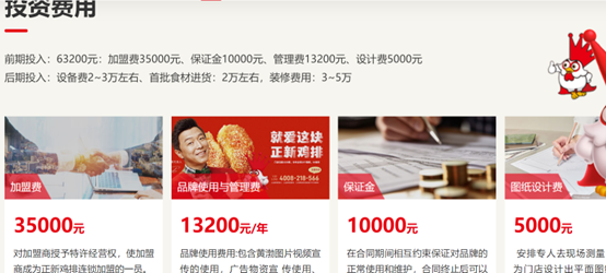 正新鸡排官网加盟页面显示,加盟正新鸡排前期需投资6.32万元,其中加盟费3.5万元,保证金1万元,管理费和设计费分别为1.32万元和5000元。