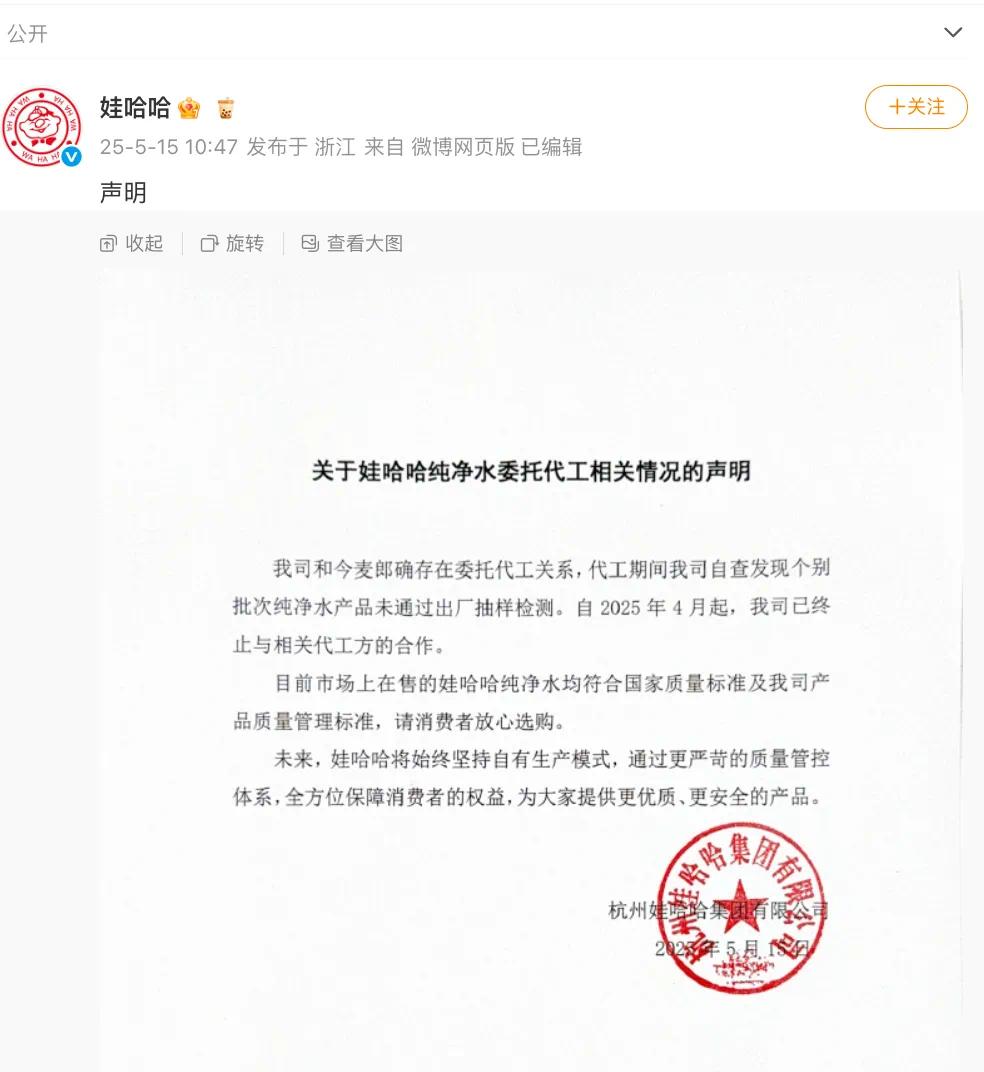 5月15日,“娃哈哈客服回应纯净水由今麦郎代工”这个话题在微博上热搜。随后,娃哈哈在官方微博上发表声明,明确了与今麦郎的委托代理关系,并表示自2025年4月以来,公司已终止与相关代理商的合作。
