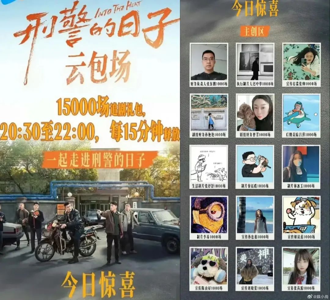 电视剧《刑警的日子》中的“全员租场”似乎恰好印证了“租场赔罪文化”的出现。一般来说,云包场都是演员、导演或制片公司“花钱请客”,而《刑警的日子》则是创作团队的所有人参与,甚至财务、后期、制作等岗位分别包括1000场。