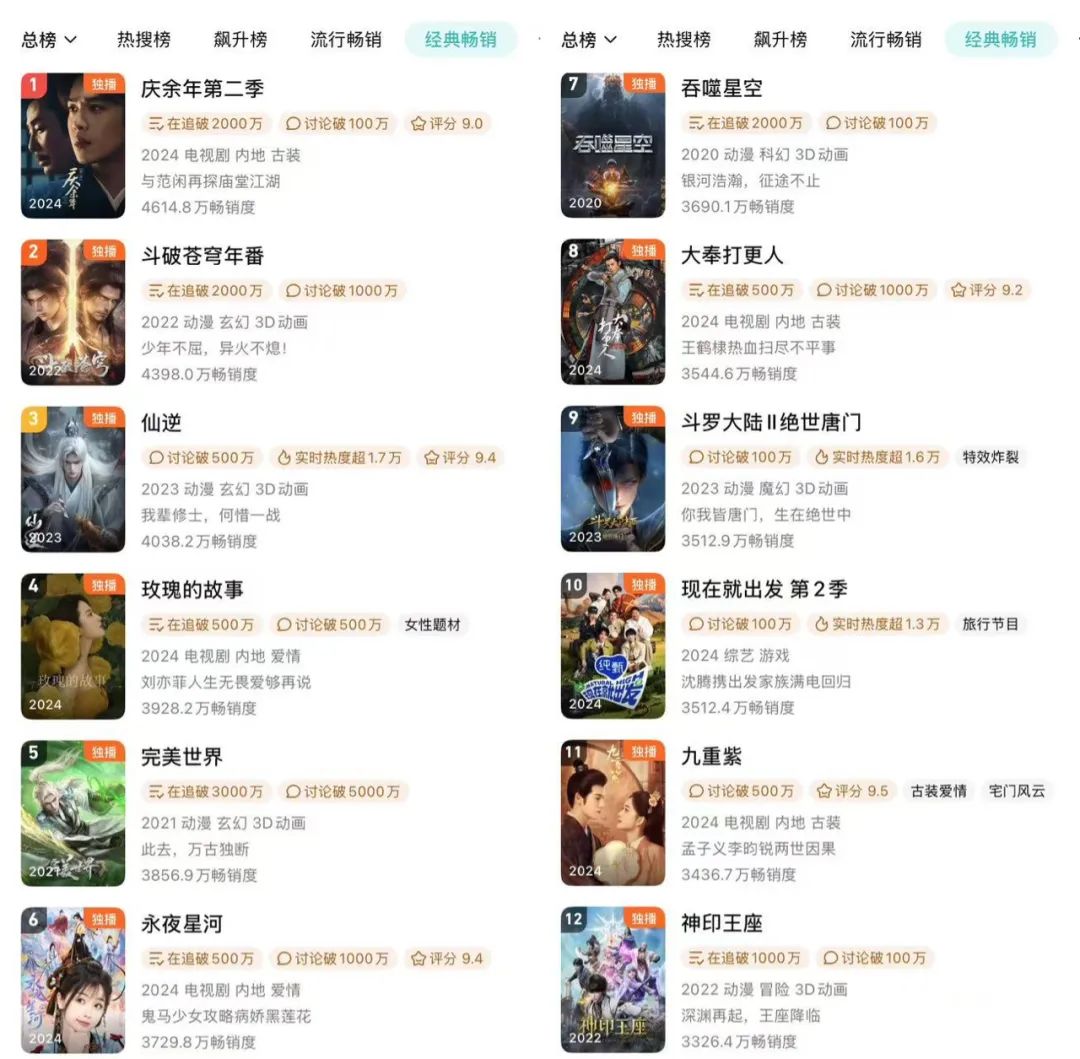 提到拉新榜,就不能不提到平台榜单机制最全面的腾讯视频。“热销周榜”和“热销年榜”已经成为粉丝跟踪剧集表现的重要指标。即使《生活的乐趣2》播出近一年,仍有人孜孜不倦地跟踪豆瓣“视觉组”的年度表现。“折腰”热播,许多人也热衷于猜测它能在几天内进入“热销年榜”。这两个新指标也成为指导网友打电话的指导。、氪金,冲热方向标。