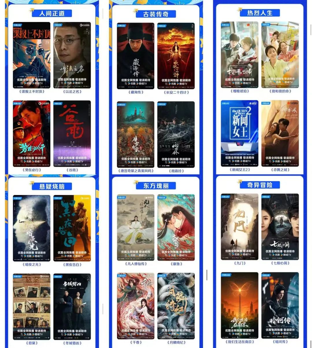 2025年,优酷提出了“剧集六边形”战略,以六大主题板块覆盖玩家的观众需求,将类型化细分与头部制作有机结合,既延续了平台在城市情感、服装、悬疑等方面的优势,又在主旋律和现实主义主题上实现了攻击。
