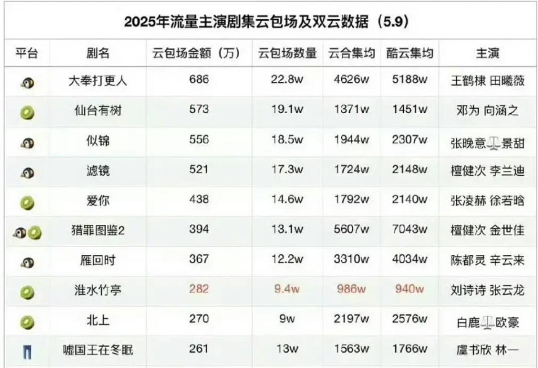 名列前茅的豆瓣@ 小组成员统计了2025年流量主演剧集云包场的数据,可以看出腾讯视频和爱奇艺剧是云包场的“大户”,而优酷还没有大规模使用这种“武器”。伴随着优酷拉新年榜的推出,在云包场这一块优酷也有望迎头赶上。随着《藏海传》即将播出,肖恩肖粉丝的战斗能力有望得到充分释放。为了让这部剧尽快冲进新年榜,租场的热情可能会让我们大吃一惊。