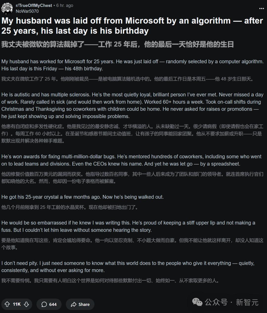 一位妻子痛苦地发帖说:我的丈夫,一位25岁的微软老员工,因为被算法选中,在48岁那天被解雇了。他甚至获奖是因为他修复了数百万美元的重大漏洞。