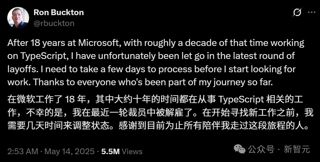 这次裁员名单中的另一名「明星员工」,Ron是TypeScript项目幕后的核心推动者。 这是Buckton。