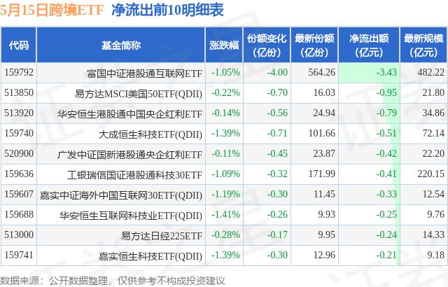 证券之星消息,5 月 15 日跨境 ETF 总资金净流出基金 4.53 亿元,近 5 一个交易日累计净流出 67.52 亿元,5 在一个交易日内,出现了日合计资金净流出。 4 天(ETF 计算资金流入的方法:(当日 ETF 现场流通份额 - 前一交易日 ETF 现场流通份额)* 当天 ETF 均价,数字仅供参考)。