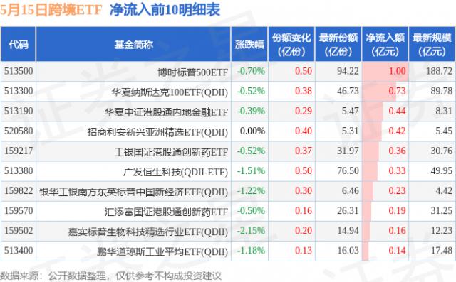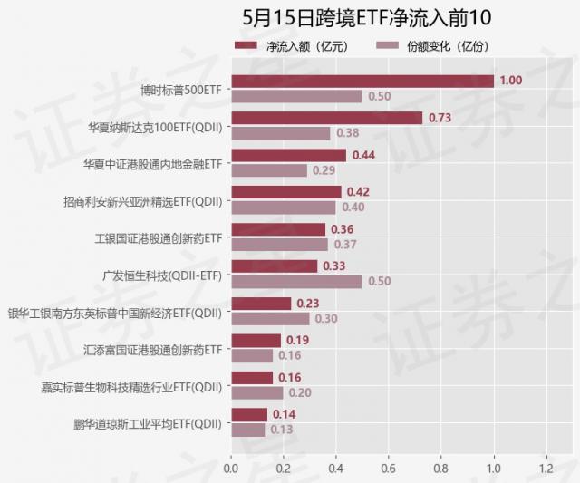 当天有 31 只跨境 ETF 资金净流入出现在基金中,其中博时标普是净流入排名第一。 500ETF(513500)增加了份额 5000.0 万份,净流入额为 1.0 亿元。