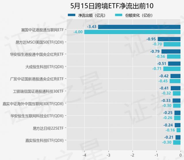 当天有 35 只跨境 ETF 资金净流出的基金,其中净流出排名第一的是富国中证港股通互联网。 ETF(159792),份额下降 4.0 一亿份,净流出额为 3.43 亿元。