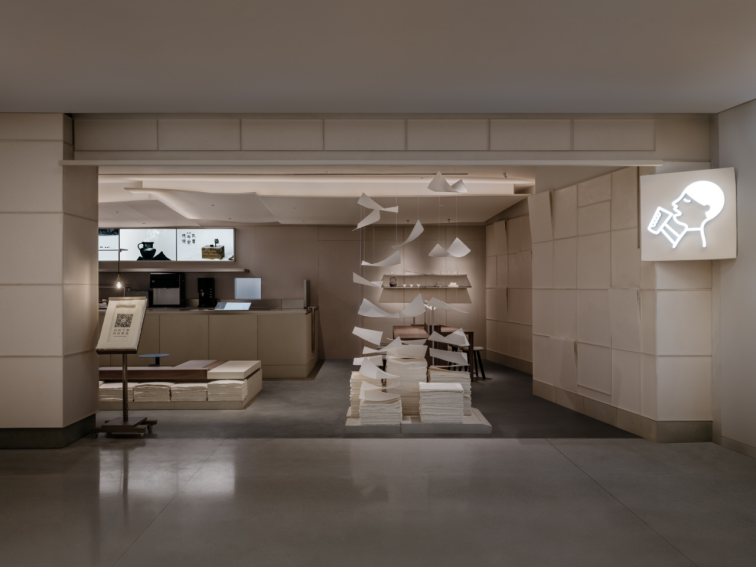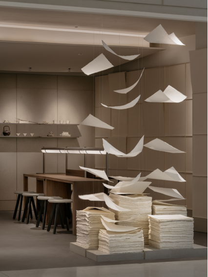 喜茶杭州天目里店位于杭州城市艺术文化空间地标建筑天目中,选择了城市诗意的一面。杭州是历代文人雅士作品中的诗意来源。喜茶以纸为媒介,使空间成为城市人文的载体。在客流量巨大的艺术空间入口处,「纸·阁」构建“纸上茶室”的问题。大约8000张手工皮纸经过裁剪、切割、装裱、粘贴等传统工艺再次成型。手工裁剪保留了纸张的天然毛刺,变成了自然漂浮的纸艺设备、展示的纸胎杯、层叠的纸垛和墙壁。爱茶充分利用纸张质感与空间光影的联系,简化复杂性,为店铺营造安静的喝茶意境,为流动人群提供一个可以长期停留的地方。